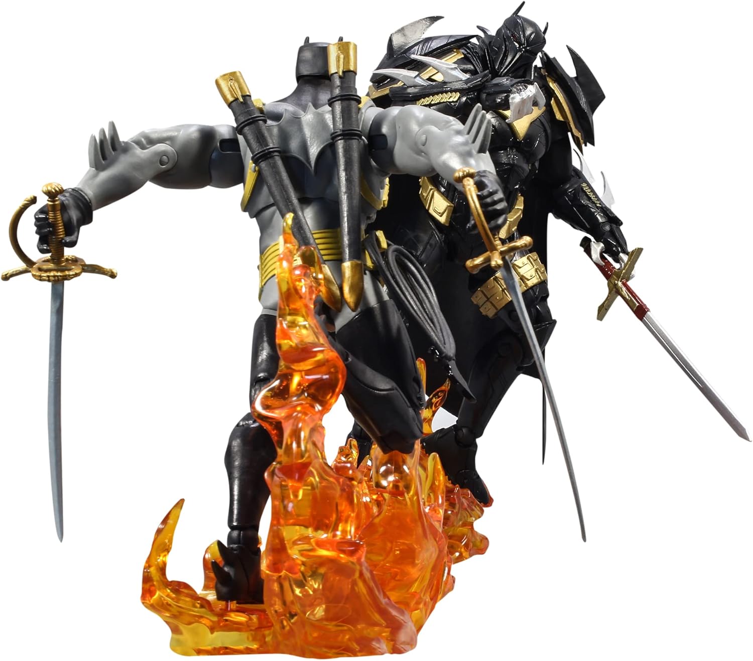 Batman includes a Batarang with rope and two rapiers with sheath. Azrael includes his sword.